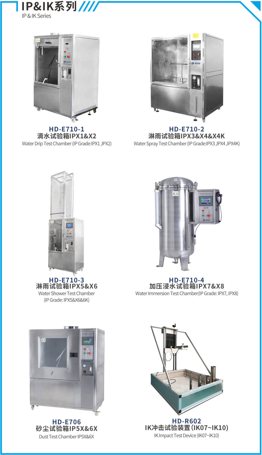 IP&IK防護(hù)測試:淋雨試驗(yàn)箱、砂塵試驗(yàn)箱與沖擊試驗(yàn)裝置適用于戶外燈具和智能路燈的防水測試及燈具照明產(chǎn)品的外殼抗沖擊強(qiáng)度測試。